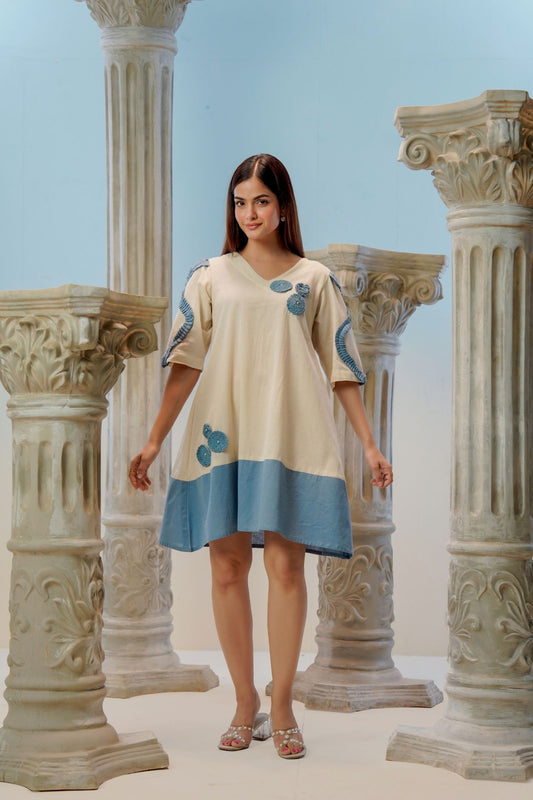 Blue Cotton Crochet Flower Short Dress